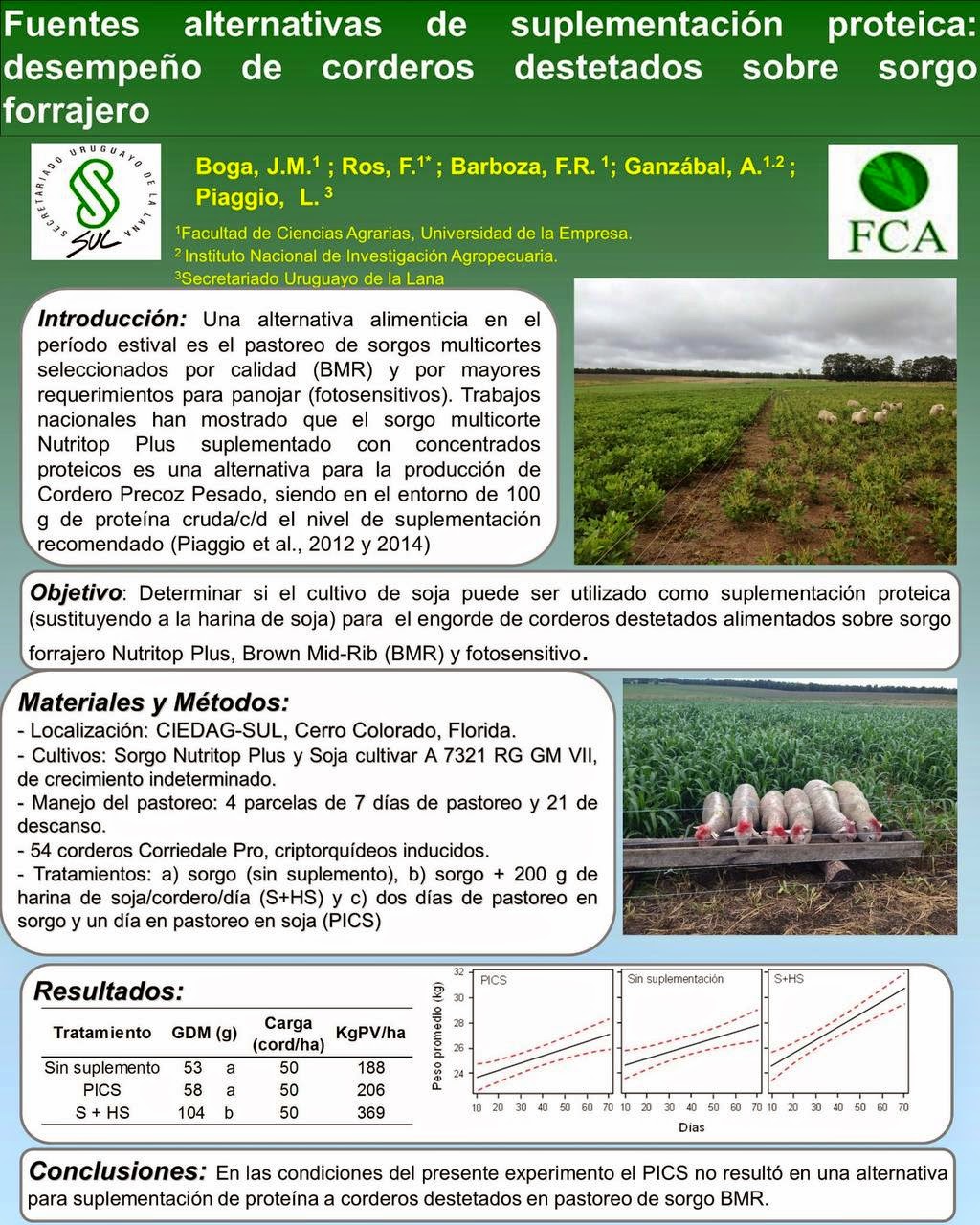 La tesis d efi de carrera de los alumnos Juan Boga, Francisco Ros, Lucìa Piaggio y Francisco Braboza; alumnos de la carrera Ingenièro Agrònomo de FCA - UDE, fue aceptada en el congreso 2014 de la AUPA ( Asociaciòn Uruguaya de Producciòn Animal)
